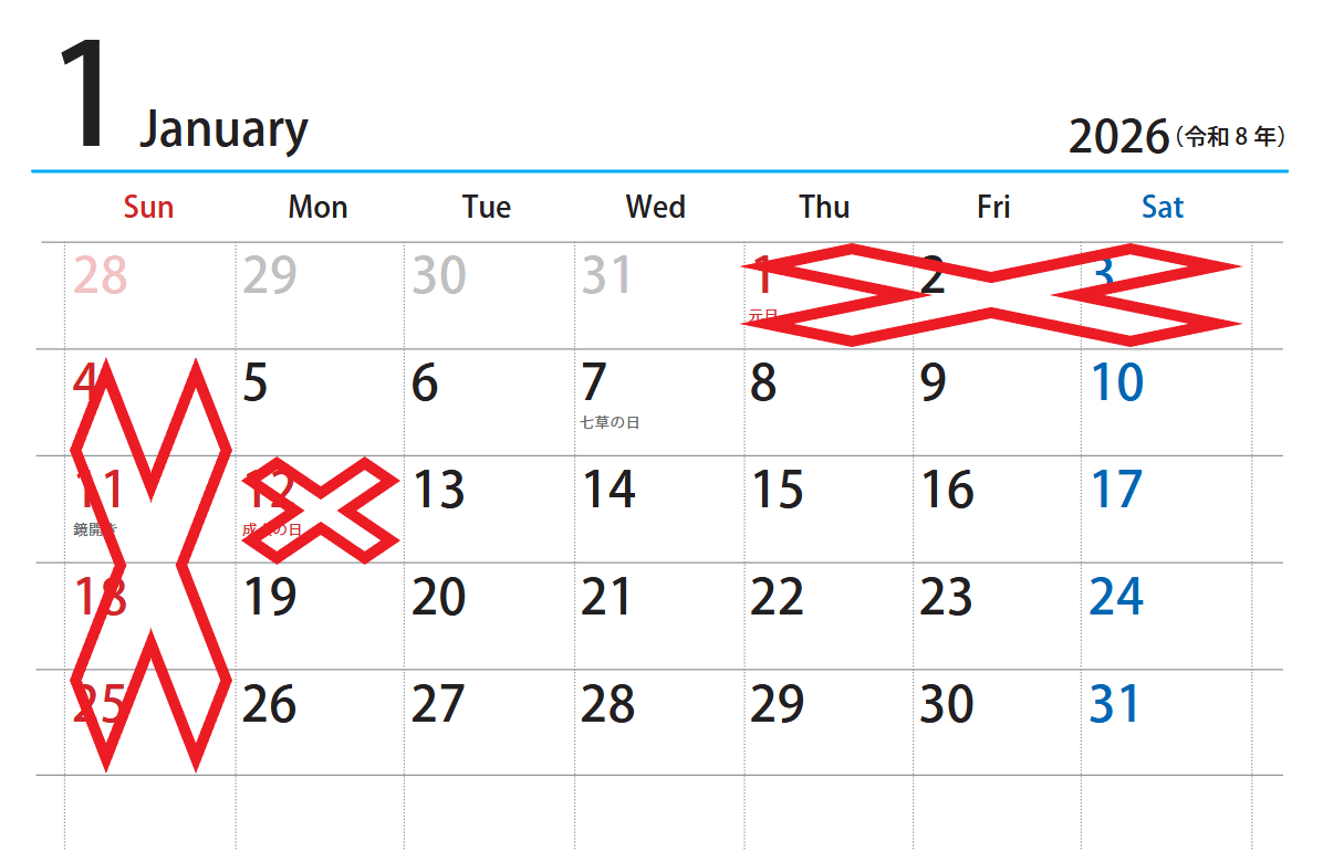 1月は1,2,3,4,11,12,18,25日がお休みとなります🙇🏻